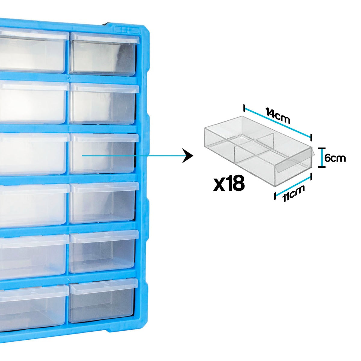 <li>18 drawers measuring 11cm x 6cm x 14cm</li>