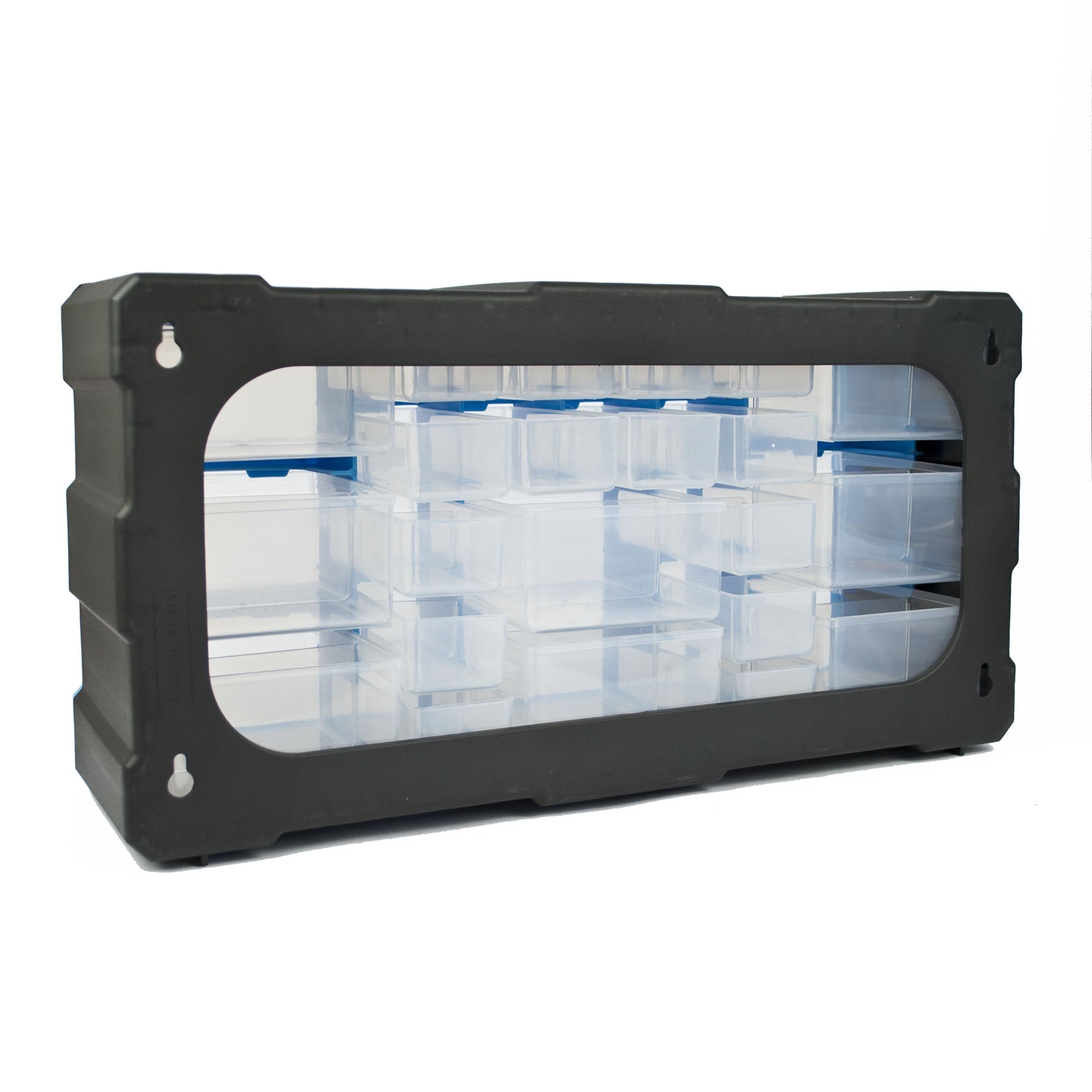 These storage units are made from a tough plastic which is both lightweight and durable. Each drawer has a protruding handle at the front for easy access, and each drawer has a stop latch inside the main unit to stop is coming out all the way. The cabinet can be used freestanding, but there are also slots on the unit for fixing to a wall if required. There are grooves on the top of each unit and ridges on the bottom, which allow you to stack organisers on top of each other if necessary. This allows you to slowly build your kit by adding a new one when necessary.