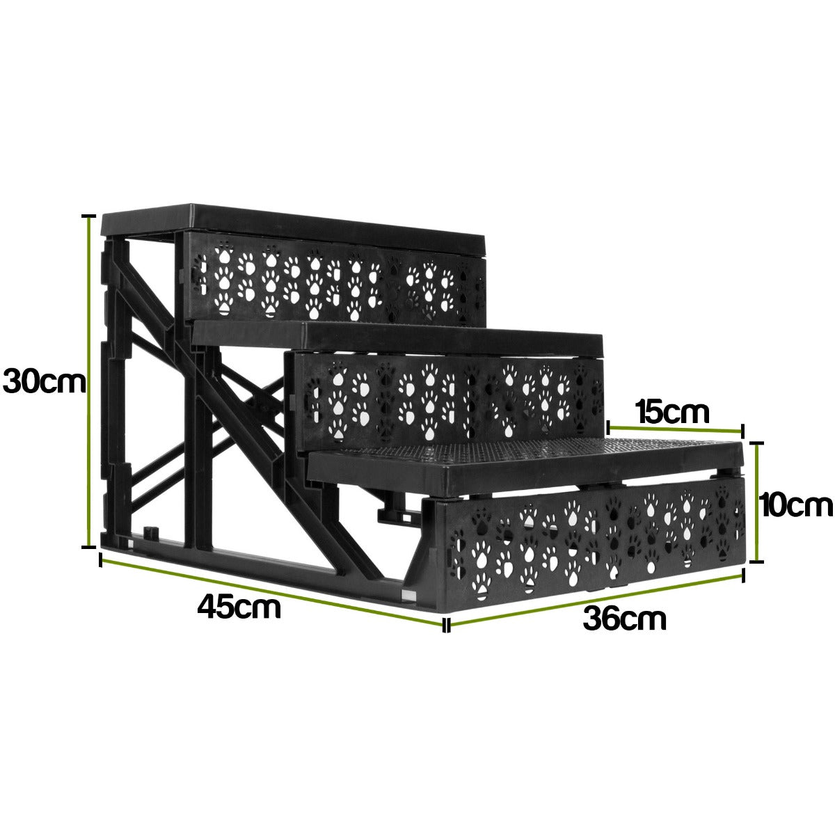- Dimensions: 45cm x 36 cm x 30cm. Each step is 10cm high and 15cm deep.