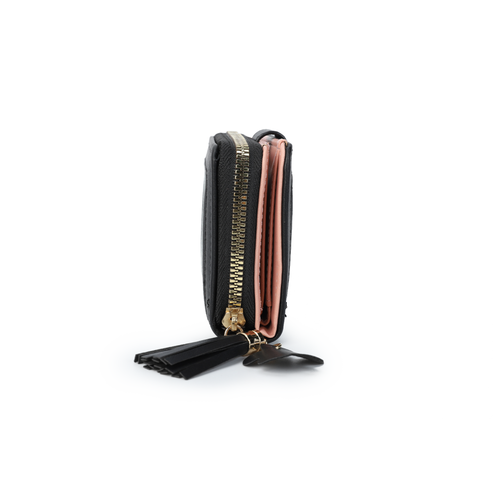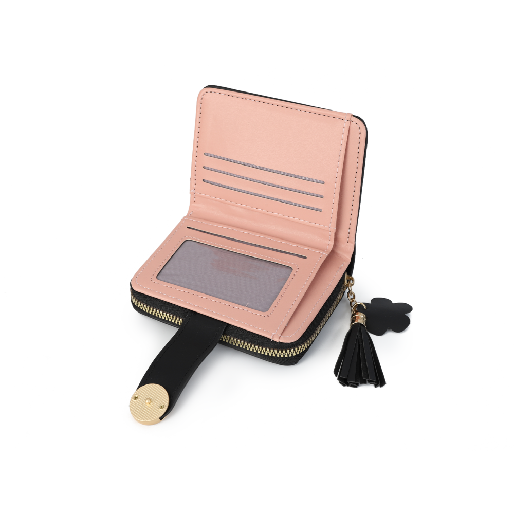 Measuring 8 cm x 10.5 cm, this small yet practical wallet is ideal for slipping into your handbag or carrying on its own. It features multiple card slots, a clear ID window, a zippered coin compartment, and dedicated sections for cash and small essentials. The smooth zipper closure keeps everything safely in place, while the chic tassel charm adds a modern, playful touch.