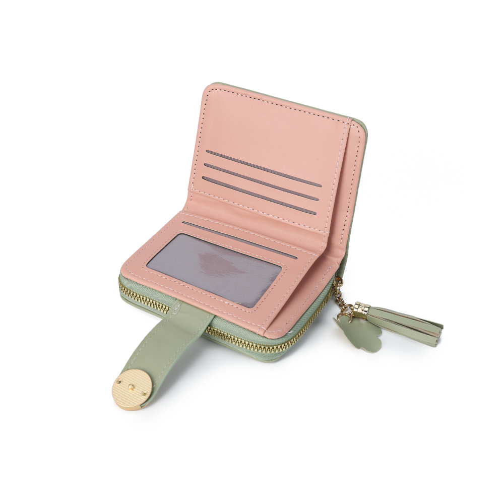 Measuring 8 cm x 10.5 cm, this small yet practical wallet is ideal for slipping into your handbag or carrying on its own. It features multiple card slots, a clear ID window, a zippered coin compartment, and dedicated sections for cash and small essentials. The smooth zipper closure keeps everything safely in place, while the chic tassel charm adds a modern, playful touch.