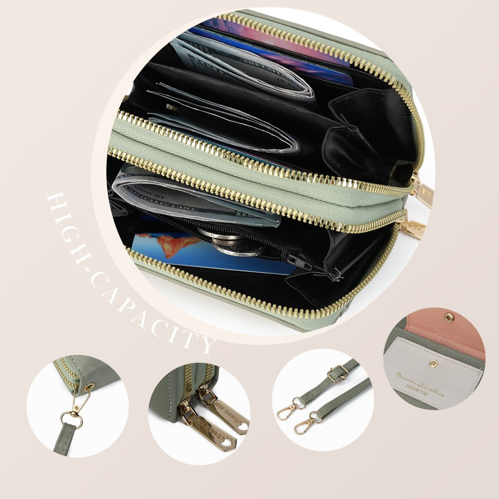 With a perfectly portable size of 9 cm x 4.5 cm x 14.3 cm, this purse is compact yet highly practical. The dual-zippered compartments and multiple card slots provide organized storage for your phone, wallet, cash, keys, headphones, and cosmetics. An additional snap-closure front pocket ensures quick access to small items while keeping them secure.