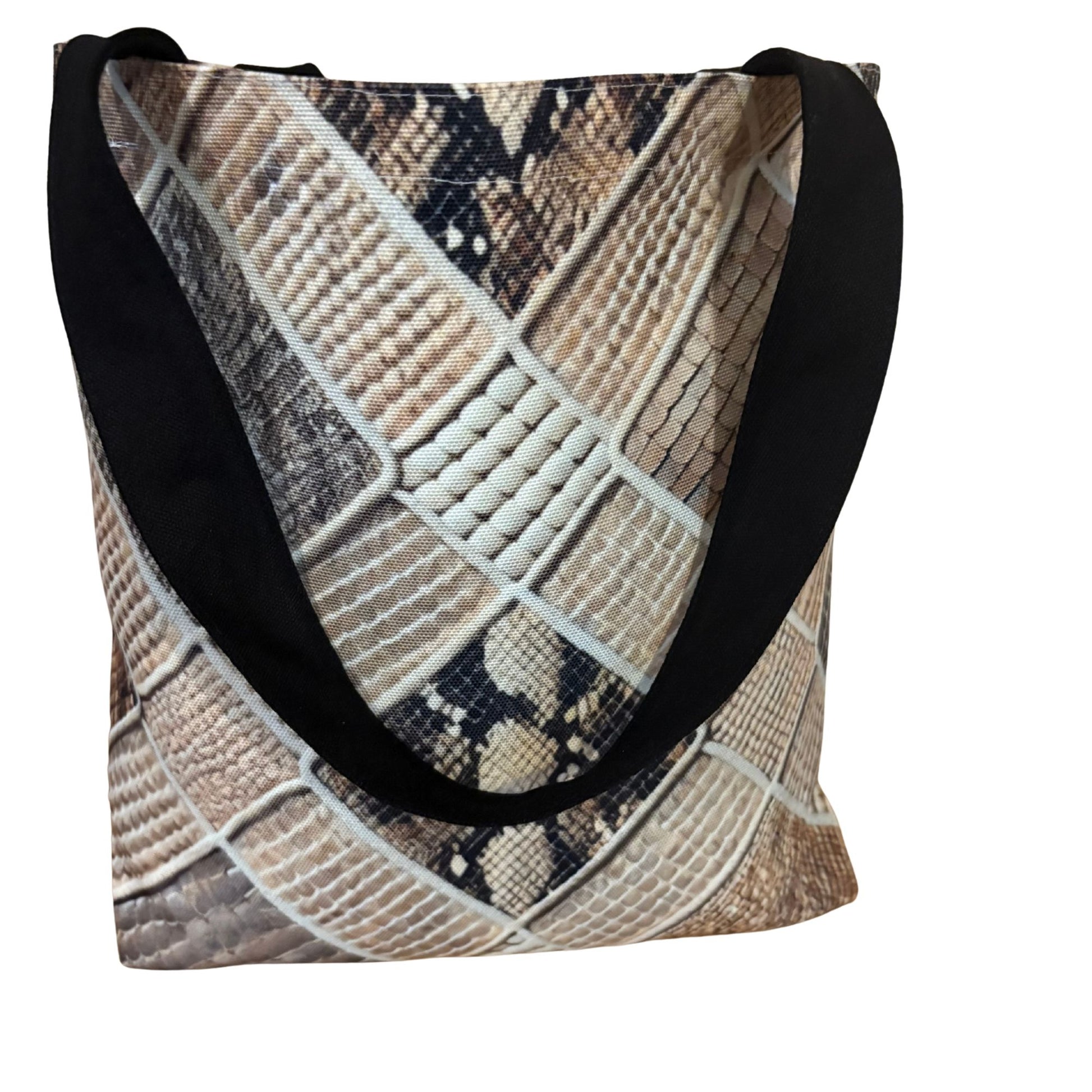Add a touch of chic, modern style to your everyday look with this faux snakeskin print canvas tote bag. Featuring a striking geometric snakeskin pattern in earthy tones of beige, brown, and black, this eye-catching bag is both fashionable and functional.